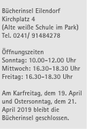 Darüber hinaus stehen neuerdings viele, viele Tonies zur Ausleihe bereit. Hierbei handelt es sich um sehr ansprechende kleine Puppen, die auf eine Tonibox, ein spezielles Abspielgerät, gestellt werden und dann ein Kinderhörspiel oder Kindermusik abspielen. Zwei Geräte sind, gegen eine Kaution von je 20 Euro, in der Bücherei ausleibar. Ebenfalls neu im Bücherregal sind Religiöse Kinderbücher zu finden.