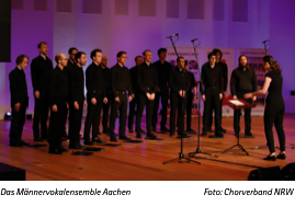 Das Männervokalensemble Aachen e.V. wurde Ende 2017 von sieben Sängern gegründet. Innerhalb eines Jahres verdoppelte es seine Mitgliederzahl um mehr als das Doppelte auf heute 18 Sänger zwischen 18 und 35 Jahren. Das junge Ensemble widmet sich einem breiten Repertoire von der Klassik bis zur Moderne, überwiegend im Bereich der a-cappella Literatur.