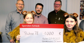 Der Gemeindeausschuss St. Severin hat den Erlös des Gemeindefestes im Juli 2025 in Höhe von 1.000 Euro an die Bühne´78 gespendet. Dieser Betrag kommt den Jugendlichen des Vereines zu Gute. Zurzeit hat der Theaterverein 39 aktive Mitglieder, 14 Jugendliche und Kinder sowie 25 Erwachsene. Der Theaterverein mit seinen begeisterten Laiendarstellern, die mit viel Herzblut und Spielfreude dabei sind, bringt zweimal pro Jahr eine Produktion auf die Bühne. Jeweils zur Weihnachtszeit wird ein Weihnachtsmärchen für die Kinder bei Kappertz und im Sommer eine Komödie für die Erwachsenen in der Klangbrücke zur Aufführung gebracht. Auf der Internetseite www.buehne78.de kann man sich über die neuen Vorstellungen und über den Ticketverkauf informieren. Viele Mitglieder sind dem Theaterverein seit vielen Jahren treu. In diesem Jahr feiert Frank Debye als „Balu“ im Dschungelbuch sein 40-jähriges Jubiläum. Auch das Weihnachtsmärchen 2025 i. Saalbau Kappertz ist für die Bühne `78 wieder sehr erfolgreich gelaufen, und die Akteure konnten sich über sehr viele strahlende Kinderaugen freuen.