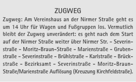 Die Organisatoren bitten an dieser Stelle die Anwohner, den Zugweg für die gesamte Zeit so autofrei wie möglich zu halten.