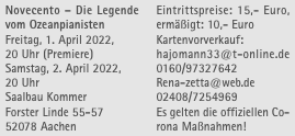 Hajo Mans bringt Alessandro Baricco’s „Novencento – Die Legende vom Ozeanpianisten“ auf die Brander Bühne. Im Saalbau Kommer erwartet die Zuschauer zur Premiere am Freitag, dem 1. April 2022, um 20 Uhr und am Samstag, dem 2. April 2022, um 20 Uhr, eine begeisternde One-man-show des Wahlaachener Hajo Mans.