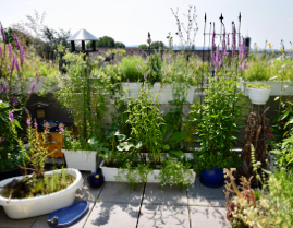 Die insektenfreundlich angelegte Dachterrasse „Hortus Aquis“ von Familie Jaschik aus Aachen Eilendorf wurde vom NABU NRW als „Schmetterlingsfreundlicher Garten“ anerkannt. Bei einer Besichtigung überreichten Betty Malangré und Martin Knörzer vom NABU-Stadtverband Aachen persönlich eine Plakette sowie die Urkunde. Als weitere Preise konnte der „Hortus Aquis“ bereits den 1. Platz im Bundesweiten Pflanzwettbewerb „Wir tun was für Bienen!“ 2021 der „Stiftung für Mensch & Umwelt“ in der Kategorie Balkone sowie die Auszeichnung „Prämierter Naturgarten in Gold“ vom Projekt „Tausende Gärten – Tausende Arten“ erlangen. Seit 2011 haben sich auf der nach dem Hortus-Prinzip von Markus Gastl gestalteten Dachterrasse in zirka 60 Gefäßen vielfältige feste Gemeinschaften aus Frühblühern, Bäumen, Sträuchern und Wildstauden gebildet. Zusätzlich pflanzt Andrea Jaschik jedes Jahr Gemüse an und sät bienenfreundliche Wildblumenwiesen. So wachsen inzwischen weit über 200 verschiedene Pflanzen in ihrem Dachgarten. An Biotopelementen gibt es auf 15 Quadratmetern ein Futterhaus und Nistkästen für Vögel, verschiedene Nisthilfen für Bienen, eine Hummelkiste, eine Totholzpyramide, ein Steinmäuerchen, ein Mager- und ein Sumpfbeet sowie einen Teich. Diese Strukturen vollenden das aus vorwiegend einheimischen Wildpflanzen bestehende Angebot für Insekten und Kleintiere. Durch die von Februar bis zum Frost durchgängig blühenden Pflanzen werden schon früh im Jahr Mauerbienen unterstützt, aber auch seltene Wildbienen-Arten angelockt, wie die Felsspalten-Wollbiene, die in Nordrhein-Westfalen als gefährdet gilt. Im letzten Sommer besuchte der Karstweißling, ein vom Kleinen Kohlweißling nur schwer zu unterscheidender und in Aachen seltener Schmetterling, den „Hortus Aquis“. Vögel werden ganzjährig gefüttert, 14 verschiedene Arten fanden sich bereits am Futterplatz ein. Besondere Freude bereitet es der ganzen Familie, wenn die Blaumeisen brüten. Im vorletzten Jahr flogen neun Jungvögel aus, im letzten brüteten sogar zwei Pärchen hintereinander im Nistkasten. Tier-Beobachtungen können auf der Dachterrasse jederzeit aus nächster Nähe erfolgen, und Andrea Jaschik ist sich sicher: Auch wenn ihr Naturgarten nur im Kleinformat angelegt ist, steht er einem richtigen Garten in nichts nach. Über ihre Erfahrungen und Beobachtungen schreibt sie regelmäßig auf ihrem Blog www. hortus-aquis.de, denn ihr Ziel ist es, auch andere Menschen für insektenfreundliches Gärtnern zu begeistern. Im März wird ein Interview über die Entwicklung der Dachterrasse zum Naturgarten online zu sehen sein, Anmeldung unter www. bio-balkon.de. Dieses Engagement wurde im vergangenen Jahr gleich dreifach mit Auszeichnungen belohnt.