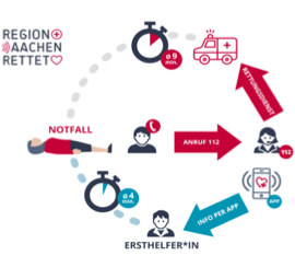 In der Region Aachen müssen jährlich ca. 1.000 Notfallpatienten wiederbelebt werden. Acht bis neun Minuten benötigt der alarmierte Rettungsdienst durchschnittlich, bis er am Patienten eintrifft. Bei einem Herz-Kreislauf-Stillstand zählt für das Überleben allerdings jede Minute: Innerhalb von 3-5 Minuten ohne Versorgung treten irreversible Schäden im Gehirn auf. Ein Überleben des Herz-Kreislauf-Stillstands ist nur möglich, wenn in den ersten Minuten mit einer effektiven Herzdruckmassage begonnen wird.