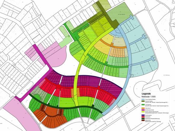Die Erschließungsanlagen sind in dem Plan unterschiedlich farblich dargestellt. Die von der jeweiligen Anlage erschlossenen und somit beitragspflichtigen Grundstücke sind farblich entsprechend der Anlage markiert. Mehrfach erschlossene Grundstücke sind daher mindestens zweifarbig abgebildet. Der Bürgerinformation folgend werden im Rahmen der Erhebung der Vorausleistungen lediglich die Kosten erhoben, die der Stadt bisher tatsächlich für den Bau der Erschließungsanalgen und die Durchführung des Ausgleichs entstanden sind.