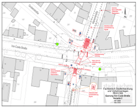 Die Nutzer der Rad-Vorrang-Route auf der nördlichen Seite der Von-Coels-Straße sollen im Verlauf der Marienstraße gegenüber dem Fahrverkehr aus der Grubenstraße bevorrechtigt werden. Hierzu soll der Kurvenbereich Grubenstraße / Marienstraße als Einmündung ausgebildet und die vorfahrtberechtigte Fahrradstraße Marienstraße über die Einmündung hinaus verlängert werden. Der südliche Arm der Einmündung (in Richtung Von-Coels-Straße) soll nur für den Radverkehr freigegeben und durch einen Poller vor dem Befahren von Kfz-Verkehr geschützt werden. Identisch zum Planungsprinzip der südlichen Seite soll die Fortführung auf den straßenbegleitenden Gehweg der Von-Coels-Straße über einen Rampenstein und somit gegenüber dem Fußverkehr untergeordnet erfolgen. Die Verschmälerung der Fahrbahnbreite auf drei Meter soll neben der Anrampung zur Verringerung der Geschwindigkeit der sich nähernden Radfahrer führen. Die Radfahrerfurt über die Von-Coels-Straße ist in direkter Verbindung zwischen der (verlängerten) Marien- und Kleebachstraße geplant. Hierfür muss die Ampel der Überquerung in Richtung Osten verschoben und mit einem Radverkehrssignal mit Anforderungstaste ergänzt werden. An der südöstlichen Ecke der Marienstraße ist die Anlage eines vergrößerten Baumfeldes mit Fahrradbügeln vorgesehen. Im Rahmen der Umgestaltung wird die Verwaltung einstimmig um Prüfung gebeten, die Aufmerksamkeit auf die Lichtzeichenanlage für den Kraftfahrzeugverkehr durch ein gelbes Blinklicht, Hinweisschilder und eine noch weitere Verschiebung in Richtung Osten zu erhöhen. Des Weiteren ist eine generelle Überprüfung dieser Ampelschaltung gewünscht, da die Grünphase für die Querung der Fußgänger zu schnell auf die Rotphase für den Kraftfahrzeugverkehr erfolgt.