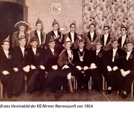 Vor mittlerweile 66 Jahren trafen sich am 9. Januar 1954 elf Karnevalsfreunde mit der Idee einen Karnevalsverein zu konstituieren im Viktoriasaal zu Nirm. Am Fettdonnerstag, dem 25. Februar 1954, war es dann soweit. Unter Leitung des 1. Präsidenten Bernhard Förster, sowie dem 1.Vorsitzenden Hubert Hallmann, wurde die „Narrenzunft Eilendorf-Nirm 1954” geboren. Auf der ersten Karnevalssitzung am 27. Februar 1954 schickte die Gesellschaft die erste Tanzmarie Gertrud Gördes und den Zeremonienmeister Peter Kolvenbach im vollbesetzten Viktoriasaal auf die Bühne. Man beteiligte sich mit einem Karnevalswagen am Rosenmontagszug, wobei der Kohlenhändler Jünger kurzfristig mit einem LKW aushalf. Durch einen Artikel in der “Aachener Volkszeitung“ Ausgabe 51 vom 2. März 1954 wird belegt, dass die KG Nirmer Narrenzunft 1954 e.V. die älteste Karnevalsgesellschaft in Eilendorf ist. In den Jahren 1954-55 konnte man mit Beate Viehs auch schon das erste Kindertanzmariechen auf der Bühne präsentieren.
