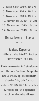 Mit einem furiosen Premierenauftakt feierte die Volksbühne Erholungsgesellschaft Eilendorf 1889 nach zwei Jahren Zwangspause ein grandioses Comeback! Vor ausverkauftem Haus im Saalbau Kappertz spielte am 13. Oktober 2019 ein bestens aufgelegtes Ensemble. Für die Freunde der heimatlichen Mundart bot der selbstgeschriebene Dreiakter „Aue Daach, joue Vermaach“ wie gewohnt viel zu lachen. Auch die Geschichte um die Ehepaare Netta und Nöll Netterscheid und Billa und Hugo Havenith steigerte sich über alle drei Akte bis zum glücklichen Ausgang. Damit bewiesen die Akteure nicht nur ihre schauspielerische Klasse, sondern trafen mit ihrem eigenen Stück auch den Geschmack ihres Publikums. Somit konnte am Premierenabend zurecht gesagt werden: Ende gut, alles gut!