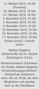 Ende gut, alles gut! So werden sich sicherlich auch die Akteure am Premierenabend auf und neben der Bühne fühlen. Selbst das Nachwuchsproblem wurde mit Kindern aus den eigenen Reihen gelöst. Mit der 35jährigen Erfahrung von Heinz Wirtz und der Thouetpreisträgerin Ina Gröbner als Mentoren könnte dies aber auch in den nächsten Jahren noch anders werden. Seit April wird fleißig geprobt und Mitte September haben sich alle auf dem traditionellen Wochenendseminar in Belgien noch einmal final für die kommenden neuen Auftritte vorbereitet. Freuen Sie sich nach zwei Jahren Abstinenz auf einen herrlich amüsanten Abend mit der Volksbühne Erholungs-Gesellschaft Eilendorf.
