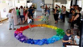 Darüber hinaus kamen wieder die Drittklässler der Schule und einige Kinder der OGS in den Genuss der Kunstprojekte. Sie alle durften, finanziert über das Landesprogramm „Kultur und Schule“, mit der Künstlerin Uschi Kütz arbeiten und präsentierten am Ende des Schuljahres ihre Werke bei einer Ausstellung in der Aula. In den Projekten führte die Künstlerin die Schüler und Schülerinnen an die Vielfältigkeit der Farben heran und gab ihnen die Möglichkeit, selbst Zeichenkünstler zu werden. In Anlehnung an große Künstler der Postmoderne, besonders in Anlehnung an Gerhard Richter, experimentierten die Kinder mit Farben, mischten einen bunten Farbenteppich und legten Bodenreliefs aus bunten Alltagsgegenständen zusammen. Große Bodenreliefs, beispielsweise in Form eines Krokodils, eines Seepferdchens oder einer roten Ente entstanden in Anlehnung an den Künstler Tony Cragg.
