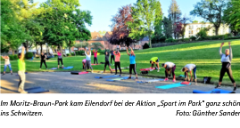 Über 20 Sportbegeisterte waren dem Aufruf gefolgt, um bei der Aktion „Sport im Park“ in Eilendorf so richtig ins Schwitzen zu kommen. Im Schatten von St. Severin, im Moritz-Braun-Park, ging es sportlich zur Sache. Da wurden die Iso-Matten ausgerollt, sich kurz warmgemacht, um dann unter fachlicher Anleitung Übung für Übung mit Freude in Angriff zu nehmen.