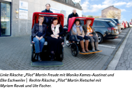 Nicht nur das Frühjahr kommt langsam ins Rollen, auch die neue Fahrrad-Rikscha des Seniorenzentrums St. Severin rollt ab sofort durch Eilendorf. Mit der Premieren-Tour durch den Stadtbezirk hat Monika Kames-Austinat, Leiterin des Seniorenzentrums und Initiatorin des Projektes in Eilendorf, die Rikscha schon erfolgreich eingeführt. „Wir bekamen direkt positive Rückmeldung von den Passanten, die auch schon gerne mitfahren würden,“, erzählt sie von ihrer ersten Tour durch Eilendorf. Offiziell wurde die Rikscha des Seniorenzentrums St. Severin im März vorgestellt, und bei bestem Fahrradwetter kamen die Bezirksbürgermeisterin Elke Eschweiler, Bezirksamtsleiter Martin Freude und alle Initiatoren und Förderer des Projektes ebenfalls in den Genuss einer Probefahrt. Die Begeisterung war bei allen Mitfahrern sehr groß, und „wir sind froh, dass es jetzt losgeht. Auch die Senioren freuen sich schon auf den Start des Projektes“ beschreibt Kames-Austinat die Vorfreude in ihrem Haus.