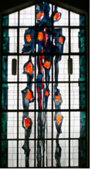 Wenig bekannt ist, dass auch der Kirchenraum der neuen evangelischen „Versöhnungskirche“ großzügig mit Kirchenfenstern ausgestattet worden ist. Neben einem farbigen Band aus kleinen quadratischen Fenstern an der Südseite wird die Kirche im Chorraum durch ein schmales Fenster in Grau-(Grisaille-)Tönen und ein breites, bis zur Decke reichendes Glasfenster belichtet. Hier gestaltete Peter Thomas in Blau und Rot niederströmende Farbbahnen, die leuchtende Farbpunkte wie Kristalle mit sich führen – sicherlich auch ein abstraktes Bild für die fließenden Bahnen des Lebens und die herabfließende Gnade göttlichen Lichtes.