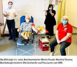 Blutspenden werden immer gebraucht. Das trifft gerade auch auf die jetzige Zeit zu, in denen die Krankenhäuser wieder Operationen durchführen und nach den Lockerungen das öffentliche Leben größtenteils wieder angelaufen ist. In Eilendorf findet der regelmäßige DRK-Blutspendetermin normalerweise in der Grundschule Brühlstraße statt. Da auch die Schulen ein Eilendorf seit kurzem wieder unterrichten und sehr komplexe Hygienepläne umsetzen müssen, wurde kurzfristig ein alternativer Raum benötigt. Da Eilendorf über keine Veranstaltungshalle und sonstige große Räumlichkeiten verfügt wurde kurzerhand auf Initiative von der Bezirksbürgermeisterin Elke Eschweiler und Bezirksamtsleiter Martin Freude der Mehrzweckraum im Vereinshaus an der Nirmer Straße als alternativer Standort vorgeschlagen. Das DRK war sehr dankbar für diesen Vorschlag, da der Termin ansonsten ausgefallen wäre. Zudem erklärten sich auch Kollegen vom Bezirksamt Eilendorf, unter anderem Manfred Thomas, bereit zur Blutspende. Für die Zukunft ist geplant, den Blutspendetermin wieder im der Grundschule Brühlstraße durchzuführen, abhängig natürlich vom weiteren Verlauf der Pandemie. Schenken Sie Leben, spenden Sie Blut!