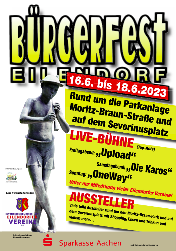 Schirmherr und Hauptsponsor ist in diesem Jahr die Sparkasse Aachen. Weiterhin wird das Bürgerfest 2023 von Möbel Krüttgen, der STAWAG, der VR-Bank, dem Beerdigungsinstitut Krüttgen, dem SSR Security-Service-Richter, Fa. WERTZ und dem Hausarztzentrum Eilendorf, A. Fischer, unterstützt. Dafür von den Organisatoren ein herzliches Dankeschön. Über viele Besucher zu allen Zeiten freuen sich Austeller und Akteure gleichermaßen, und sie heißen alle herzlich willkommen.