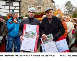 Bernd Thomas ist seit 30 Jahren beim Eilendorfer Weihnachtsmarkt engagiert und organisiert dort unter anderem die Losbude, deren Einnahmen der Eilendorfer Vereinswelt zugutekommen. Fabia Kehren dankte Bernd Thomas dafür, dass sich kleine und große Eilendorfer jedes Jahr wieder auf den Weihnachtsmarkt freuen können. Leo Frings gilt seit sieben Jahrzehnten als vehementer Kämpfer für die Interessen der Eilendorfer Bevölkerung und ihrer Vereine. In seiner politischen Arbeit hat er nicht nur Spuren in Eilendorf sondern in ganz Aachen und darüber hinaus hinterlassen. Für Leo Frings ist es auch in Zukunft wichtig, dass sich viele Bürger in unserem Stadtteil in Vereinen und Institutionen weiter engagieren!